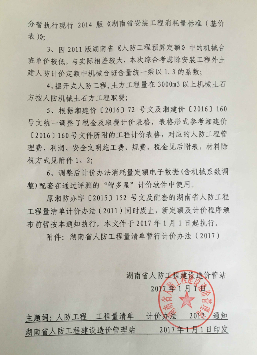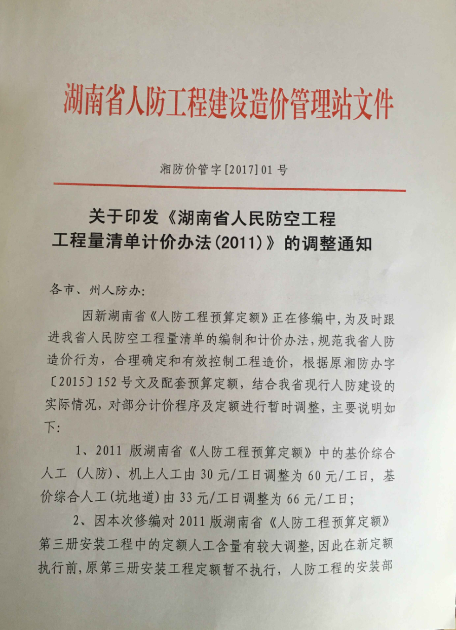 湖南省人防工程建設(shè)造價(jià)管理站于2017年1月1日發(fā)布了湘防價(jià)管字[2017]01號(hào)關(guān)于印發(fā)《湖南省人民防空工程工程量清單計(jì)價(jià)辦法(2011)》的調(diào)整通知。湖南人防定額全面實(shí)施營(yíng)改增,現(xiàn)智多星工程項(xiàng)目造價(jià)管理軟件已同步更新。現(xiàn)將相關(guān)升級(jí)事宜規(guī)定如下: