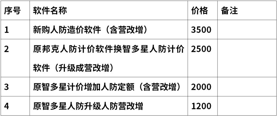 三、 收費(fèi)說(shuō)明:人防軟件銷售價(jià)格及升級(jí)人防營(yíng)改增價(jià)格如下:
