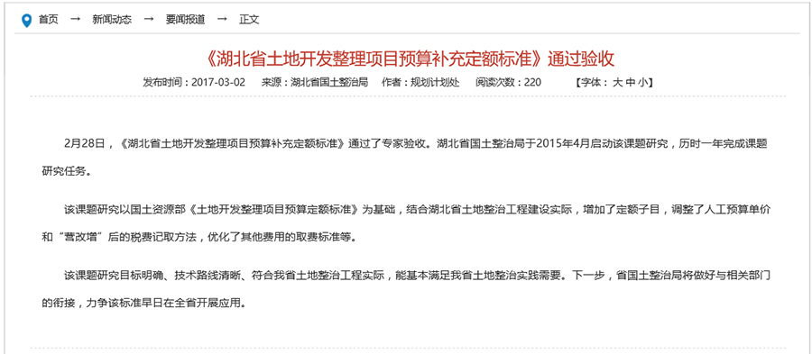 《湖北省土地開發(fā)整理項(xiàng)目預(yù)算補(bǔ)充定額標(biāo)準(zhǔn)》通過驗(yàn)收