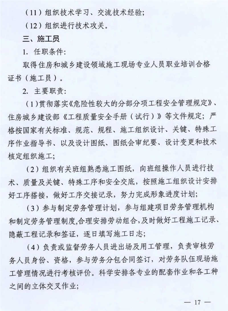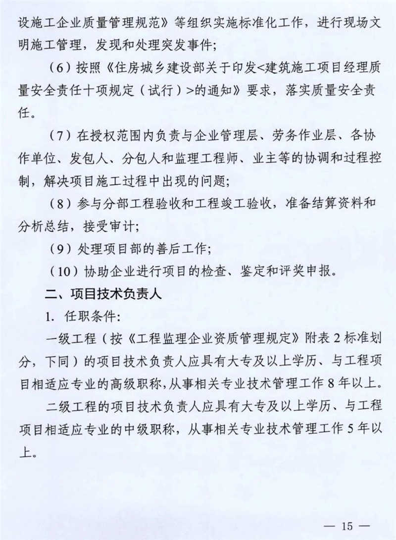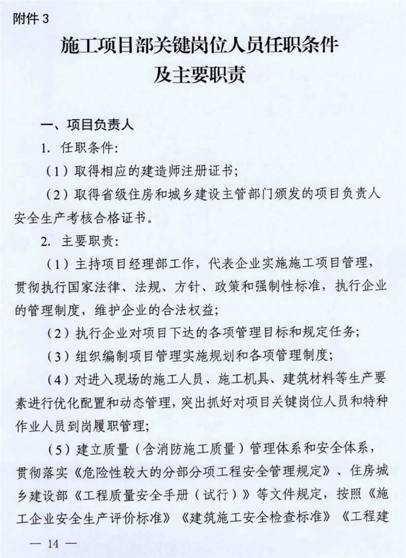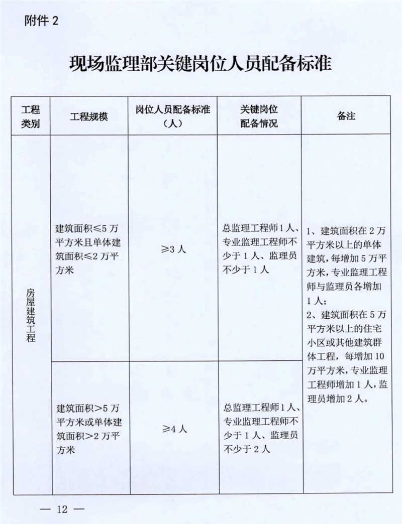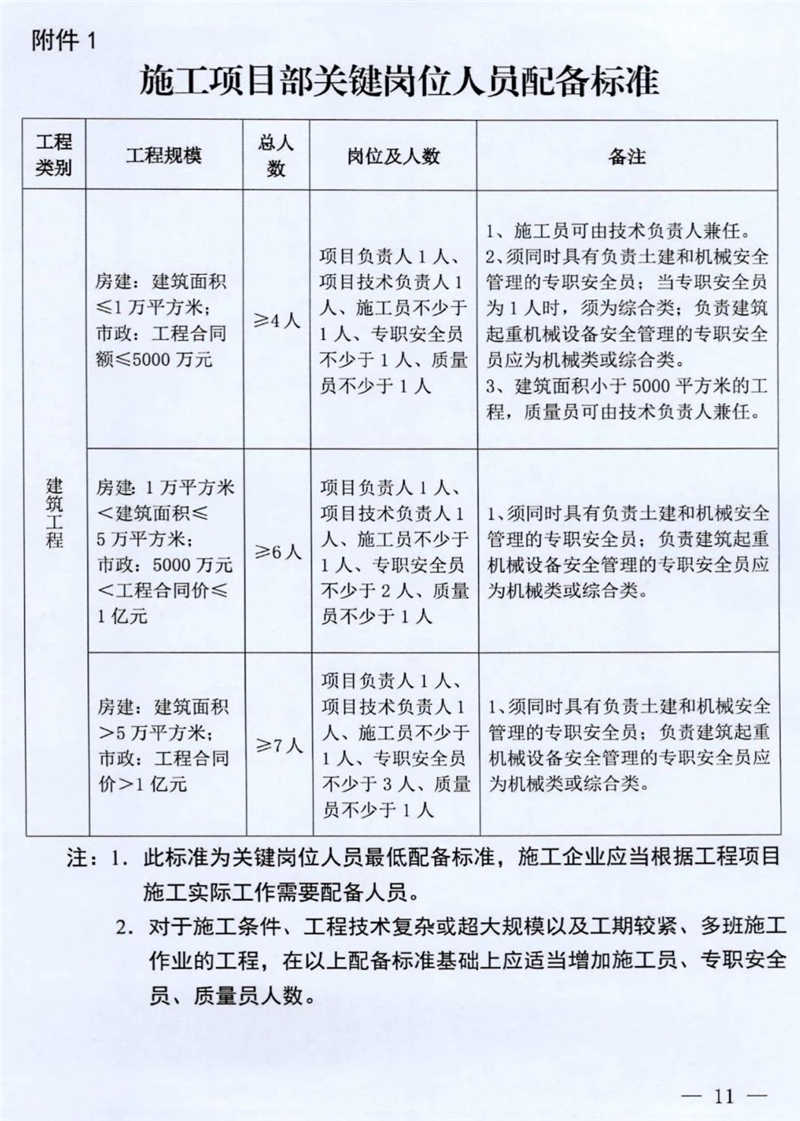 第三條 建筑工程施工項(xiàng)目部、現(xiàn)場(chǎng)監(jiān)理部關(guān)鍵崗位人員數(shù)量不得低于本辦法規(guī)定(施工項(xiàng)目部關(guān)鍵崗位人員配備標(biāo)準(zhǔn)見附件1、現(xiàn)場(chǎng)監(jiān)理部關(guān)鍵崗位人員配備標(biāo)準(zhǔn)見附件2),且必須按規(guī)定認(rèn)真履行崗位職責(zé)(施工項(xiàng)目部關(guān)鍵崗位人員任職條件和職責(zé)詳見附件3,現(xiàn)場(chǎng)監(jiān)理部關(guān)鍵崗位人員任職條件和職責(zé)詳見附件4)。施工企業(yè)應(yīng)根據(jù)工程需要配備其他相應(yīng)的管理人員。