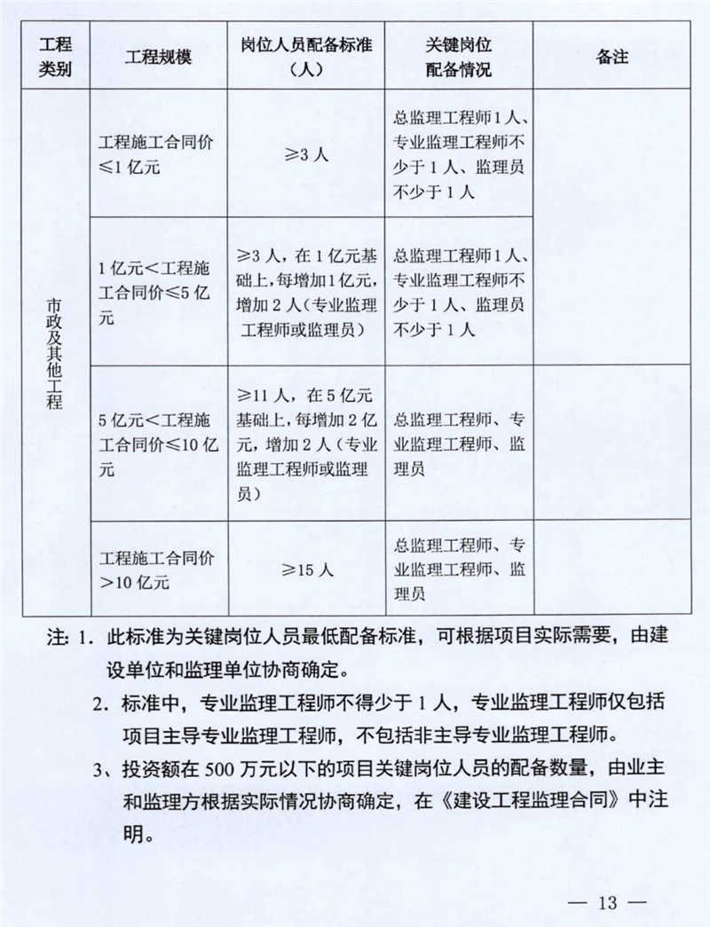 對(duì)施工項(xiàng)目部、現(xiàn)場(chǎng)監(jiān)理部關(guān)鍵崗位人員數(shù)量進(jìn)行優(yōu)化縮減,僅規(guī)定不同規(guī)模最低崗位數(shù)量。