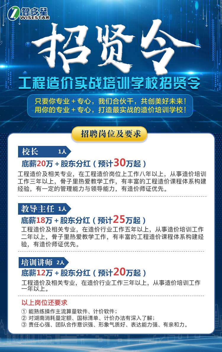智多星軟件公司一家新三板掛牌企業(yè),股票代碼:832557,是湖南省最大的工程管理軟件研發(fā)與銷售的高新技術(shù)公司,公司擁有近10萬工程造價軟件用戶群體。為解決造價用人單位與從業(yè)人員的困惑與痛點,解決造價行業(yè)所面臨的問題,智多星將投入大量資金與資源,充分利用自身優(yōu)勢與行業(yè)影響力,立志在三年內(nèi)打造一所最專業(yè)的工程造價實戰(zhàn)培訓(xùn)學(xué)校。同時,將利用智多星——湖南造價軟件金字招牌與大量的用戶單位,加之遍布全省的湘軍咨詢集團(智多星的子公司)80家分公司,給優(yōu)秀學(xué)員提供直接上崗的就業(yè)機會。