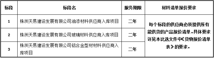 1.5采購項目內(nèi)容:為株洲天易建設(shè)發(fā)展有限公司物資供應(yīng)商入庫等,具體詳見比選文件第三“采購需求”。